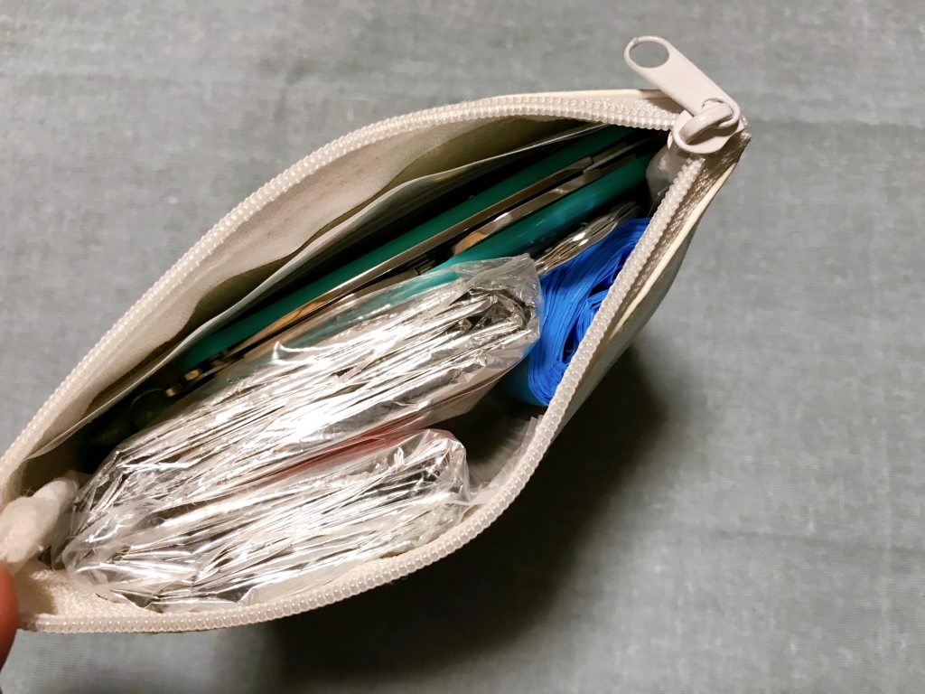 が、入れるとコンパクトさに欠けてしまうのでポーチには入れませんでした。余った袋とかウェットティッシュとかと共に持ち出し袋に入れておきます。