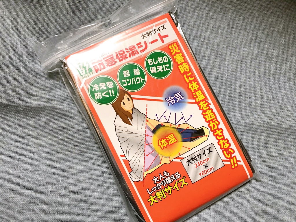 防寒保温シート。寝袋式のもあったんですがかさ張りそうなのでコチラにしました。