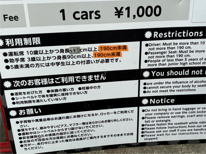 座るアトラクションなので正確に必要なのは身長ではなくて座高な気がしますが。最近は座高計らないし分からない人も多いだろうから制限としては身長を用いるというのは分かるんですが、身長は190cm未満だけれど190cmの人以上の座高の人は危なくないのかなとか思ったり。まあ明らかに危なそうだったら乗る時に注意されるか。