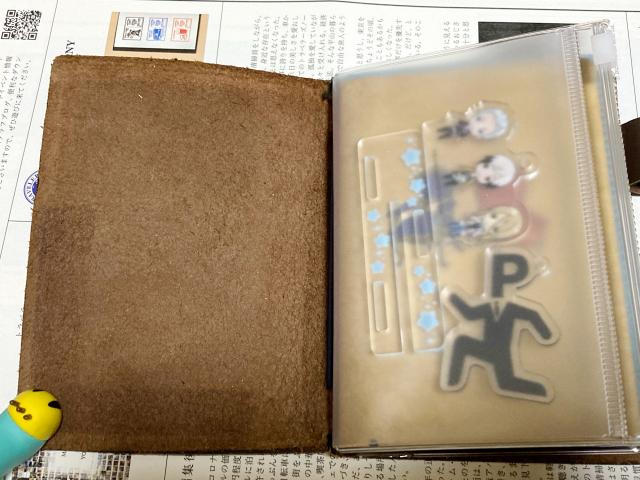 パスポートサイズだとあんまりアクスタ入れられないかなーと思ってたんですが、サイズ的に高さ11cmくらいまでなら入れられました。流石に台座は一緒に入りませんでしたが。