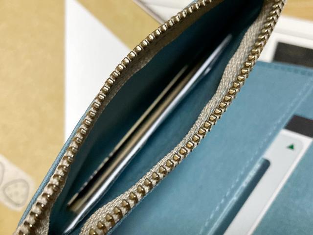 使用頻度の低い、でもたまに使うポイントカードは外のカードポケットに、落としたくない物や予備のお金はジッパーの中に入れておく感じで。フラグメントケースからそのまま移したのでお札が四つ折りになってますが、二つ折りで十分入りますしそっちの方が取り出しやすいです。